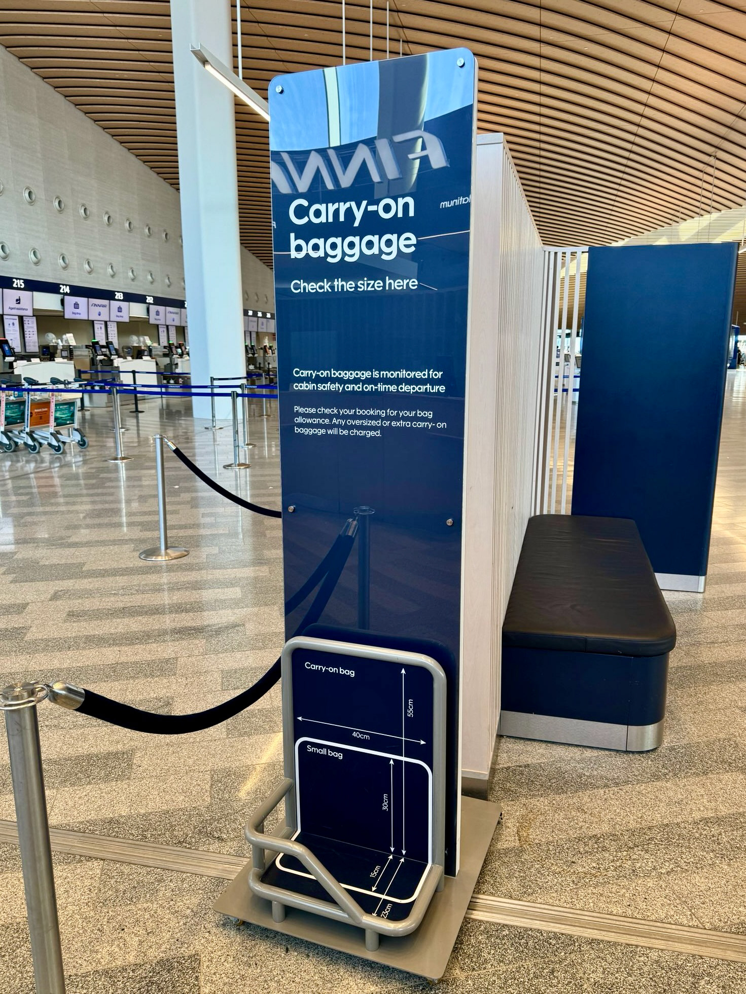 Heavy-duty metal frame for testing luggage against airline carry-on size restrictions. Modeled in 3D to ensure accurate dimensions and structural stability. The final frame and graphics were produced by Finnair and its suppliers.